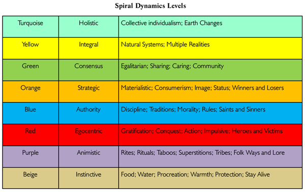 Some people are born into some stages of the spiral and need to integrate other colors. Lower stages are not necessarily bad. Also “higher” stages can’t exist without the lower ones.